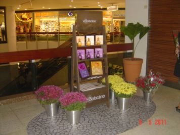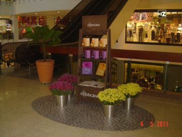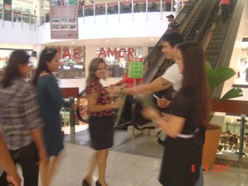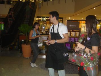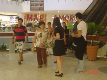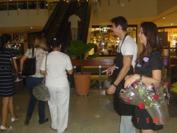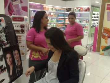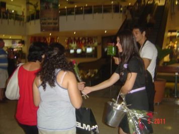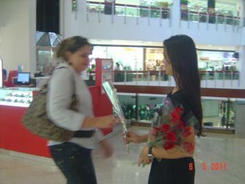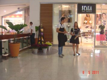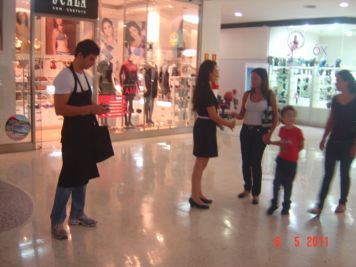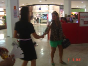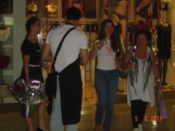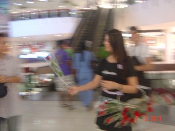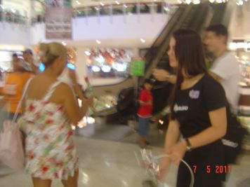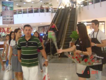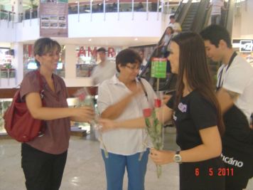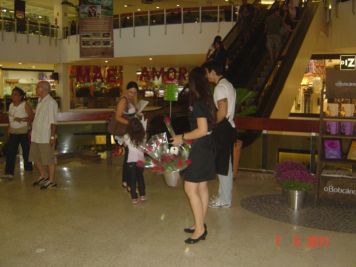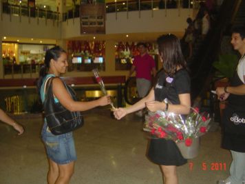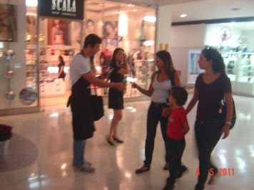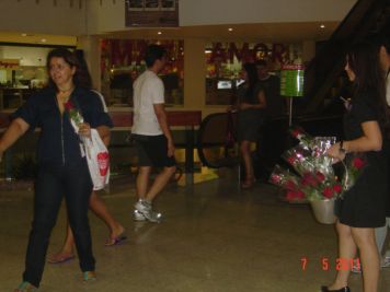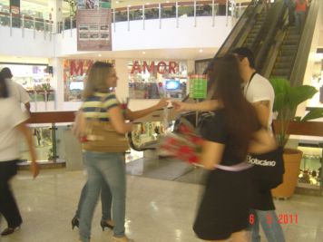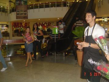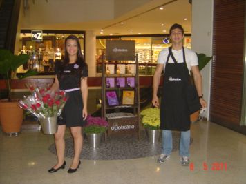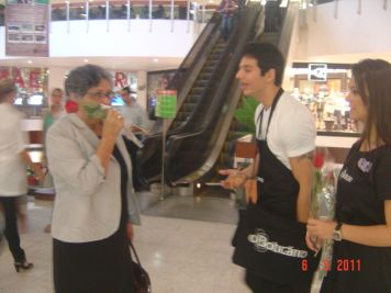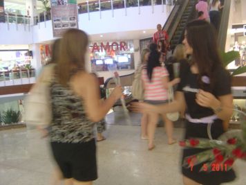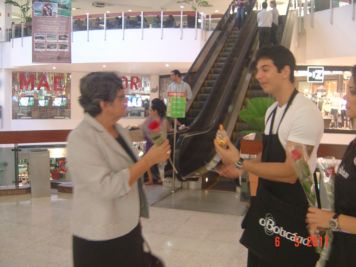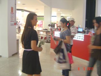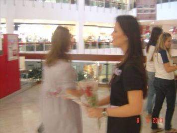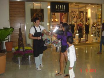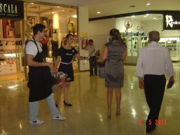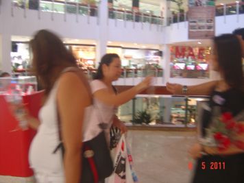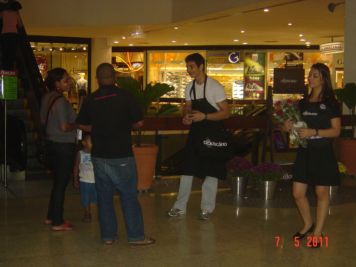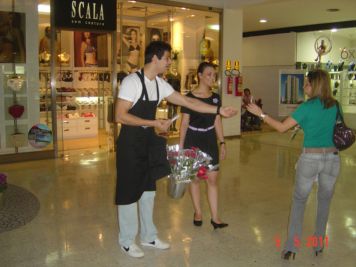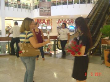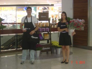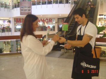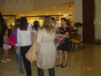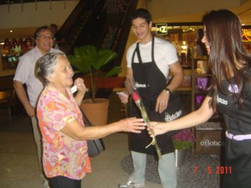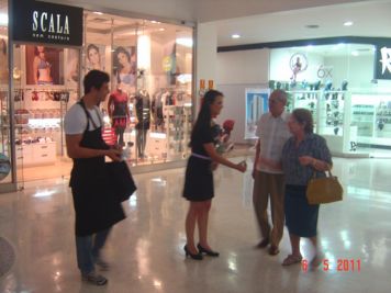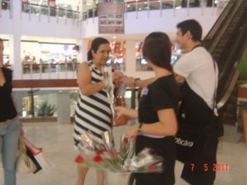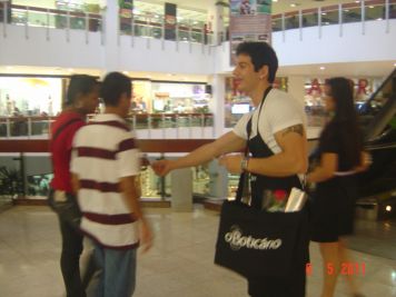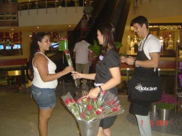 O Boticário fez uma ação de sampling no Goiabeiras Shopping, com a entrega de fitas olfativas e botões de rosas.